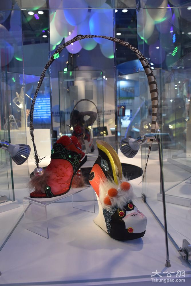 圖:香港展區(qū)內(nèi)一雙京劇臉譜風格的高跟鞋/大公報記者張寶峰攝