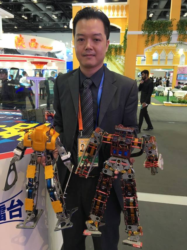 香港館另一處觀者如潮的看點是兩款格斗機械人,這兩個身高40厘米、全身骨骼暴露的錘頭鯊格斗機械人(Tri-Robot T5)可是不折不扣的“武林高手”,據(jù)設(shè)計者翁永陽介紹,通過自行研發(fā)程序及伺服馬達控制板,它們能夠進行快速反擊,“能做出跟人完全一致的格斗動作”,不僅代表了香港同類機械人設(shè)計的最高水平,在國際同類型機械人中也屬上流水平。