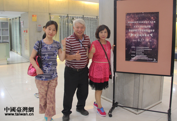 臺北觀眾陳先生、鐘女士(右)與楊小姐(左)散場后在演出海報前拍照留影,要把照片發(fā)上臉譜網(wǎng)(facebook),將北京學子送來的精彩和感動傳遞給更多臺灣民眾。(中國臺灣網(wǎng) 王思羽 攝)