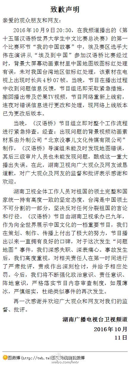 10 月11日晚,湖南衛(wèi)視官方微博發(fā)布致歉聲明,稱《漢語橋》節(jié)目組對整個工作流程進行緊急排查,經查:出現(xiàn)問題的背景視頻動畫素材系由外制公司“北京沒事兒 文化傳媒有限公司”制作,《漢語橋》導演組未能及時發(fā)現(xiàn)地圖錯誤,其后三級審片人員也未能發(fā)現(xiàn)問題,釀成這一重大播出失誤。在此,湖南衛(wèi)視向廣大觀眾及網 友誠懇道歉,對廣大觀眾及網友的監(jiān)督和批評表示感謝和歡迎。以下為致歉聲明全文: