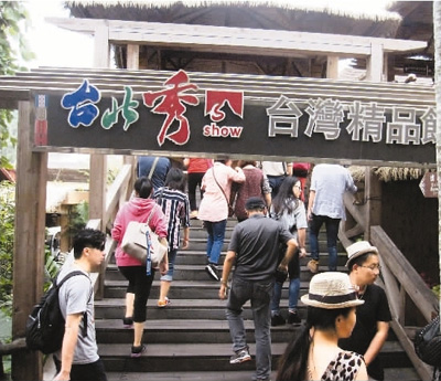 海南黎族的文面、檳榔、米酒等生活習(xí)俗與臺灣少數(shù)民族相同,海南保亭甘什嶺檳榔谷原生態(tài)黎苗文化區(qū)因此成為兩岸交流基地。圖為園區(qū)內(nèi)的臺灣精品館。