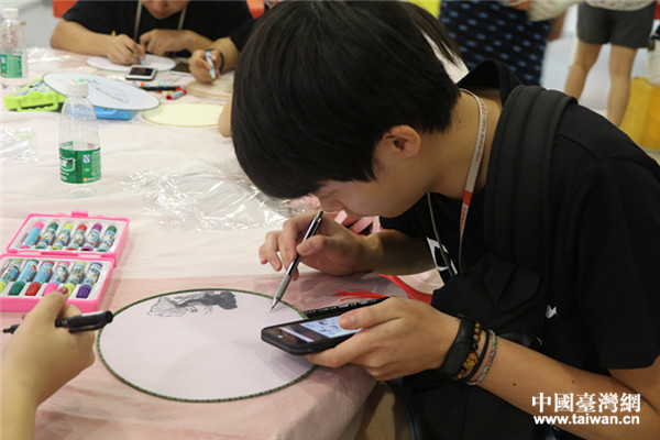 在首博的互動(dòng)教室,兩岸青年正在體驗(yàn)手繪扇面。(中國(guó)臺(tái)灣網(wǎng) 郜利敏 攝)