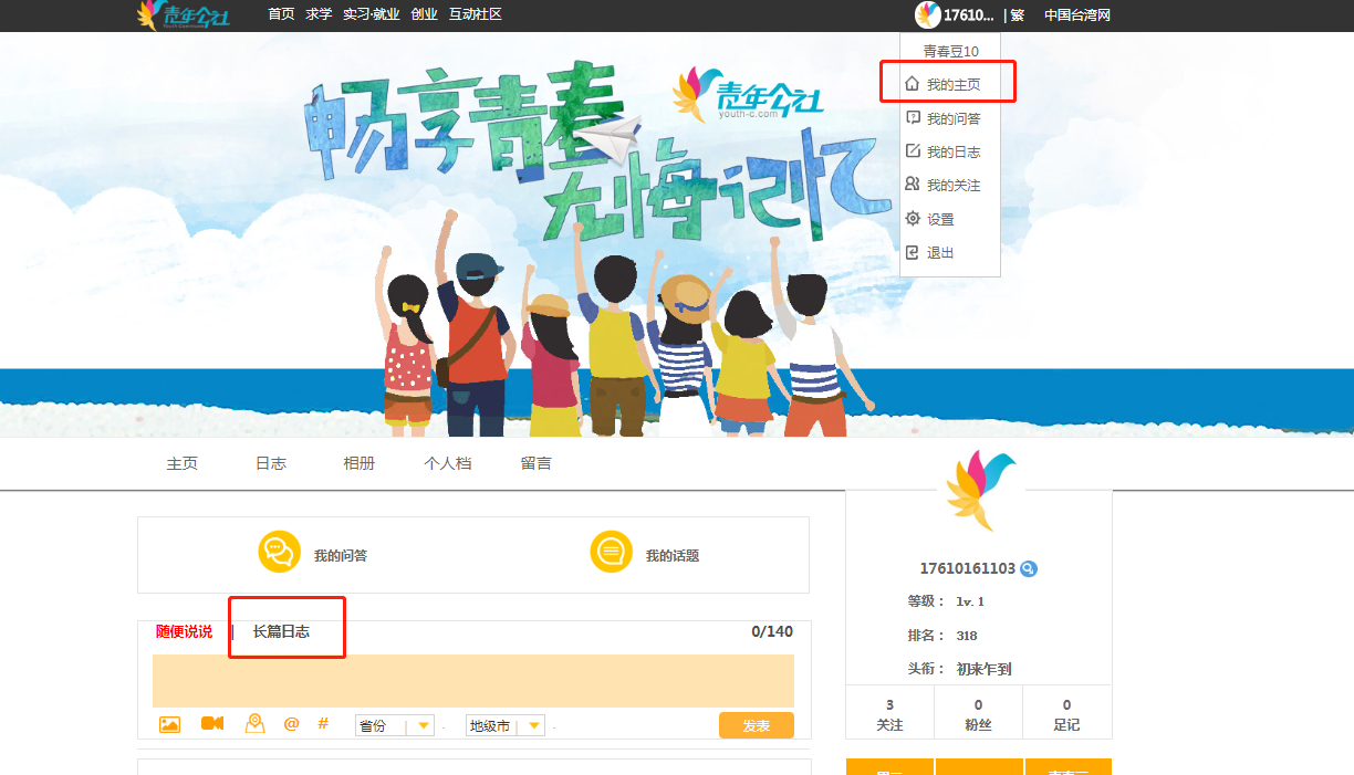 1.在電腦上(劃重點:電腦上)打開青年公社(http://y.taiwan.cn),使用郵箱或者手機號碼進行注冊,成為青年公社尊貴會員!然后登錄“個人主頁”發(fā)表“長篇日志”。