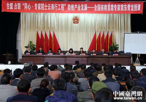 中國臺灣網(wǎng)11月30日華寧訊 11月28日,臺盟、臺聯(lián)“同心·專家院士云南行工程”在華寧縣青龍鎮(zhèn)舉辦核桃種植技術(shù)培訓(xùn)。臺盟云南省委主委、云南省臺聯(lián)會長楊曉紅,臺盟云南省委、云南省臺聯(lián)秘書長何原文,臺盟中央社會服務(wù)部扶貧工作處調(diào)研員劉曉英以及玉溪市委統(tǒng)戰(zhàn)部、華寧縣、青龍鎮(zhèn)有關(guān)領(lǐng)導(dǎo)出席培訓(xùn)班開班儀式。青龍鎮(zhèn)200余人參加培訓(xùn)。