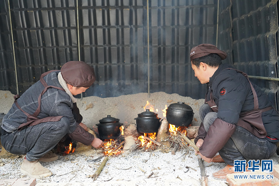 汪程輝(左)和朋友正在往火塘里添柴火(2020年12月30日攝)。新華網(wǎng)發(fā)(李丹 攝)