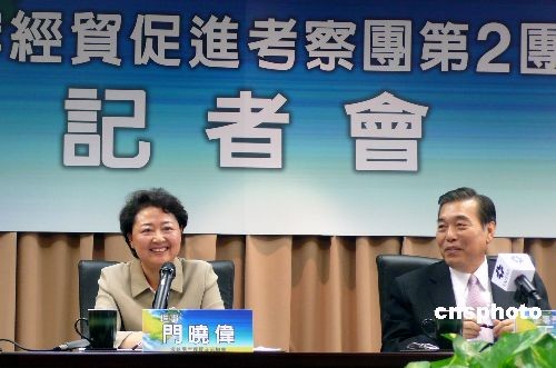 七月十七日下午,第二批“兩岸經(jīng)貿(mào)促進(jìn)考察團(tuán)”團(tuán)長(zhǎng)、商務(wù)部商貿(mào)服務(wù)司副司長(zhǎng)門(mén)曉偉(左)在離臺(tái)記者會(huì)中披露,在以流通食品、百貨及消費(fèi)品為主的采購(gòu)中,兩岸企業(yè)五天來(lái)現(xiàn)場(chǎng)成交金額達(dá)一億四千六百萬(wàn)美元,未來(lái)一年內(nèi)采購(gòu)意向超出六億美元,圖為她和臺(tái)北世貿(mào)中心董事長(zhǎng)王志剛在記者會(huì)中。 中新社發(fā) 劉舒凌 攝