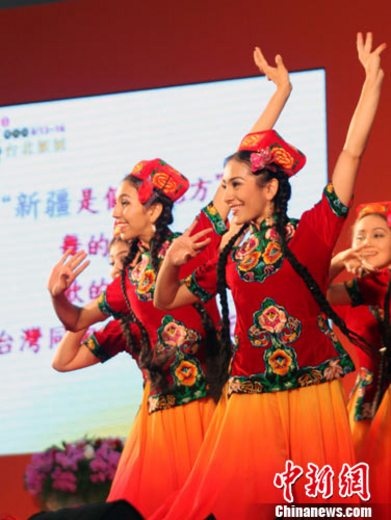 8月14日,來自新疆的少數(shù)民族舞者在第五屆海峽兩岸臺北旅展上帶來精彩的民族舞蹈。大陸31個省區(qū)市和新疆生產(chǎn)建設兵團的旅游協(xié)會組成約1200人的團隊來臺,并首度展銷合一、面向臺灣民眾推介旅游產(chǎn)品。中新社發(fā) 劉舒凌 攝
