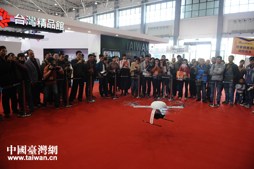 在臺灣精品館門口,一只大“蜘蛛”模樣的飛行物在空中旋轉(zhuǎn),吸引了大批市民的視線。據(jù)介紹,這是一款多旋翼專業(yè)攝影系統(tǒng),主要用于綠色生態(tài)的土地測繪,完成高空拍攝任務(wù)。通過無線遙控器操控,每次可持續(xù)飛行43分鐘,如電力不足或信號中斷,會自動回航,回到最開始的起飛點(diǎn)。