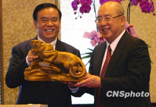 6月9日,中國(guó)國(guó)民黨榮譽(yù)主席吳伯雄臺(tái)灣圓山酒店歡迎浙江省長(zhǎng)呂祖善一行訪臺(tái)并互贈(zèng)禮物。浙江省代表團(tuán)此行以“探親會(huì)友、交流合作”為主題,將舉辦系列浙臺(tái)經(jīng)貿(mào)文化交流合作活動(dòng),并到社區(qū)、鄉(xiāng)村、企業(yè)、學(xué)校參觀學(xué)習(xí)。 中新社發(fā) 宋吉河 攝