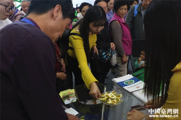 展區(qū)現(xiàn)場,參展觀眾品嘗黃金百香果。(中國臺灣網(wǎng) 郜利敏 攝)