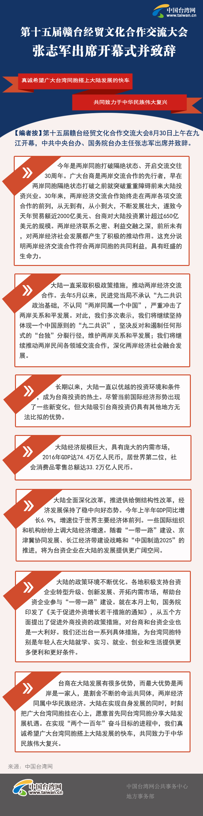 “江西逐漸成為臺商投資興業(yè)和承接?xùn)|部臺資企業(yè)轉(zhuǎn)移的新高地”——中共中央臺辦、國務(wù)院臺辦主任張志軍:2003年以來,在江西省委、省政府的高度重視下,贛臺會已成功舉辦了十四屆,達(dá)成了諸多兩地合作項(xiàng)目和共識,成為大陸中部地區(qū)對臺經(jīng)貿(mào)文化交流合作的重要平臺,為促進(jìn)兩岸經(jīng)濟(jì)社會發(fā)展、密切兩岸各界關(guān)系、增進(jìn)民眾福祉作出了積極貢獻(xiàn)。江西是“長珠閩”的直接腹地,處于國家“一帶一路”和長江經(jīng)濟(jì)帶戰(zhàn)略交匯點(diǎn),區(qū)位優(yōu)勢明顯、戰(zhàn)略平臺疊加、生態(tài)環(huán)境優(yōu)良,發(fā)展勢頭強(qiáng)勁。長期以來,江西省各級黨委、政府高度重視推動贛臺交流合作,大力開展對臺招商引資,切實(shí)為臺商、臺企排憂解難,依法保護(hù)臺商投資權(quán)益,贏得臺商的廣泛信賴和贊譽(yù),江西也逐漸成為臺商投資興業(yè)和承接?xùn)|部臺資企業(yè)轉(zhuǎn)移的新高地。希望廣大臺商抓住中部崛起等重大戰(zhàn)略實(shí)施的機(jī)遇,積極參與大陸“一帶一路”、長江經(jīng)濟(jì)帶建設(shè),在合作雙贏中實(shí)現(xiàn)企業(yè)自身的發(fā)展壯大。中央臺辦、國務(wù)院臺辦將一如既往支持江西在深化兩岸交流合作中發(fā)揮更大的作用。