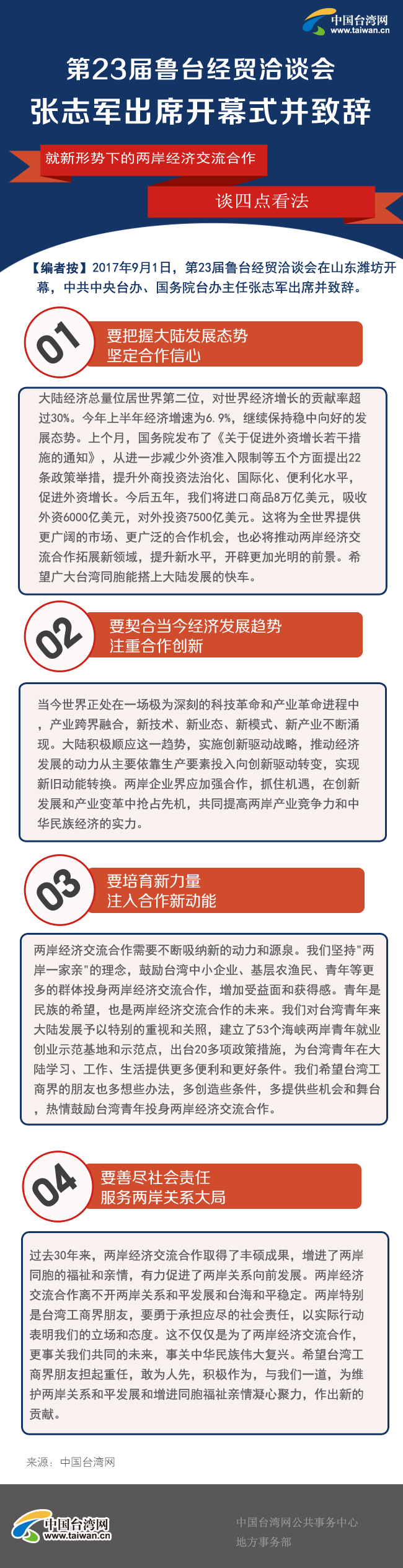 “希望廣大臺灣同胞能搭上大陸發(fā)展的快車”——中共中央臺辦、國務(wù)院臺辦主任張志軍:改革開放以來,山東經(jīng)濟(jì)社會快速健康發(fā)展。在大陸各省區(qū)市中,2016年山東省經(jīng)濟(jì)總量位居第三,超過6.7萬億元人民幣。山東基礎(chǔ)設(shè)施完善,產(chǎn)業(yè)門類齊全,發(fā)展?jié)摿薮,是大陸最具競爭活力的省份之一。山東與臺灣有著深厚的歷史淵源,山東籍的臺胞人數(shù)眾多,魯臺合作具有扎實(shí)的基礎(chǔ)。山東省委、省政府高度重視對臺交流合作。從上世紀(jì)九十年代初到現(xiàn)在,不管臺海形勢如何演變,每年堅(jiān)持舉辦魯臺經(jīng)貿(mào)交流治談會,至今已是23屆,在大陸舉辦的涉臺經(jīng)貿(mào)活動中創(chuàng)造了一個(gè)記錄。山東的這份堅(jiān)持和執(zhí)著,結(jié)出了魯臺合作的豐碩成果,也成為兩岸關(guān)系和平發(fā)展的縮影和寫照,展示出兩岸民間交流合作強(qiáng)大的生命力。希望魯臺會持續(xù)辦下去,越辦越好。中共中央臺辦、國務(wù)院臺辦將一如既往地支持魯臺不斷深化交流合作,并為此繼續(xù)作出努力。