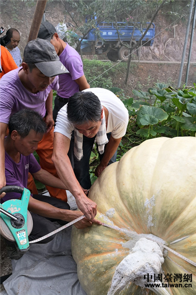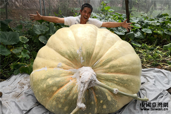 臺灣“南瓜達人”徐滄浩在梅州種出1040斤南瓜,或創(chuàng)中國最重南瓜紀錄。(圖片來源:梅江區(qū)臺辦)