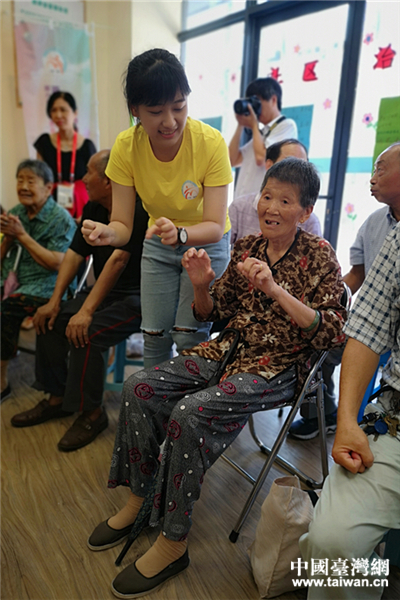 臺灣高校社工系師生和福州市馬尾區(qū)新港社區(qū)老人其樂融融。(中國臺灣網(wǎng) 郜利敏 攝)