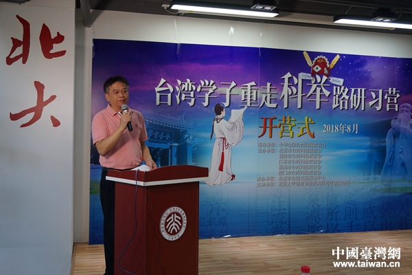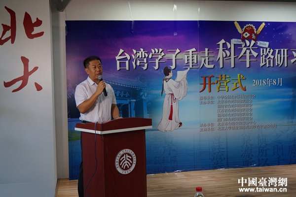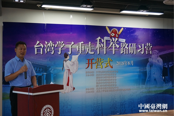 中國臺灣網(wǎng)8月21日廈門訊 8月20日下午,“臺灣學子重走科舉路研習營”在廈門北京大學創(chuàng)業(yè)訓練營兩岸青年創(chuàng)客空間隆重開營。中華全國臺灣同胞聯(lián)誼會研究室主任陳立謙、北京市臺灣同胞聯(lián)誼會副會長王慧、北京市臺灣同胞聯(lián)誼會名譽會長盧咸池、福建省臺灣同胞聯(lián)誼會副會長蘇甦、福州市臺灣同胞聯(lián)誼會副調(diào)研員許峰、臺灣華梵大學前校長高柏園、臺灣銘傳大學廣播電視學系主任杜圣聰?shù)瘸鱿_營式。曾舉辦過“科舉制度在臺灣”高校巡展的臺灣華梵大學、銘傳大學師生和在京青年臺胞大學生組成的研習營及相關單位嘉賓50余人參加了開營式。