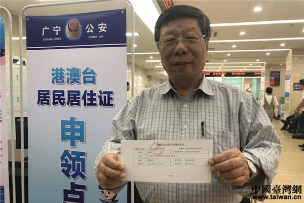 中國臺灣網(wǎng)9月6日肇慶訊 9月1日上午,廣東省肇慶市臺商協(xié)會會長林谷豐帶領(lǐng)11名臺灣同胞來到肇慶市廣寧縣行政服務(wù)中心,在通過簡單的填表、錄制指紋后,就拿到了居住證領(lǐng)取憑證!坝辛司幼∽C之后,解決了我們外出搭乘高鐵不能自助取票的問題,在經(jīng)商投資方面也更方便,我會動員我們臺商協(xié)會的成員來申領(lǐng)這個居住證!绷止蓉S還說,“居住證的發(fā)放,是一項十分便民的措施,是落實惠臺31條和踐行“兩岸一家親”理念的具體體現(xiàn)!