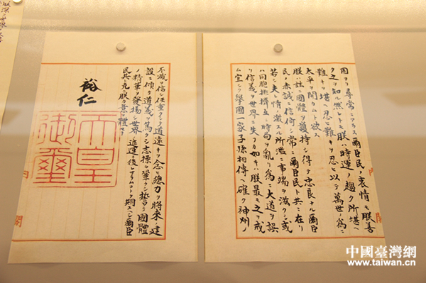 日本裕仁天皇的投降詔書。(中國(guó)臺(tái)灣網(wǎng) 李寧 攝)