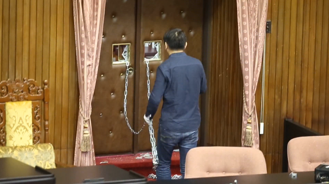 議場內(nèi)大門玻璃被敲碎,并用鎖鏈鎖住。(圖片來源:臺灣《中時電子報》)