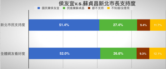 調(diào)查結(jié)果顯示,民進黨年底如果推派蘇貞昌出征對決侯友宜,侯友宜在新北市依然能拿下51.4%的支持度,遠勝蘇貞昌的27.4%;此外,如果是游錫堃出征,恐怕也討不到便宜,侯友宜依然拿下53.6%支持度,大勝游錫堃的28.2%。