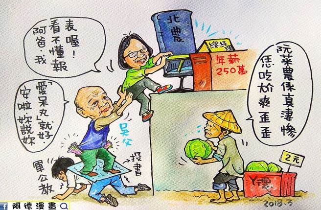 因北農(nóng)連續(xù)休市事件,有網(wǎng)友貼出一張插畫狂酸當事人。畫中“吳父”踩著跪在地上的軍公教,將女兒推上年薪250萬的北農(nóng)總經(jīng)理位置,女兒說“阿爸,我看不懂報表喔”,阿爸則回她“安啦!你說你‘愛呆丸’就好…”;而一旁手捧2元高麗菜的農(nóng)民則在飆淚。