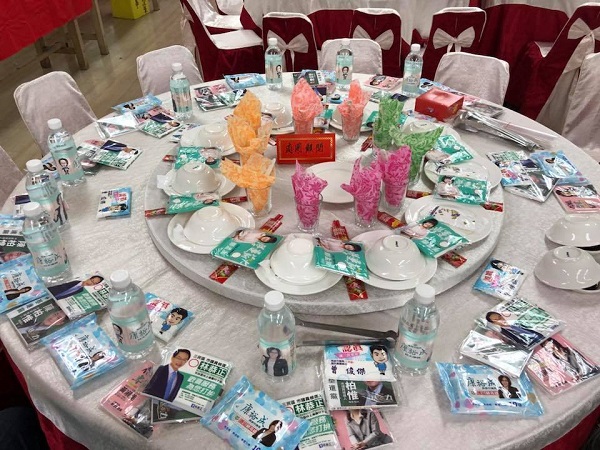 網(wǎng)友出席宴請(qǐng),看見餐桌上擺滿市議員候選人的競選面紙和礦泉水,讓他非常傻眼。(圖片來自臺(tái)媒)
