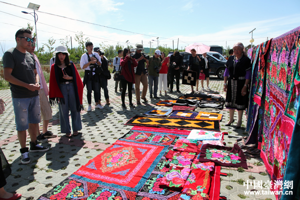 村民向采風(fēng)團成員推銷哈薩克族羊毛毯。(中國臺灣網(wǎng) 王怡然 攝)