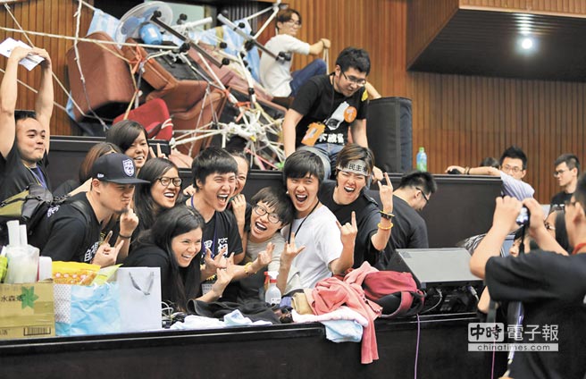 島內(nèi)2014年爆發(fā)“太陽(yáng)花學(xué)運(yùn)”,圖為參與占領(lǐng)“行政院”行動(dòng)的學(xué)生在議場(chǎng)內(nèi)興奮地合影。(圖片來(lái)源:臺(tái)灣《中時(shí)電子報(bào)》)