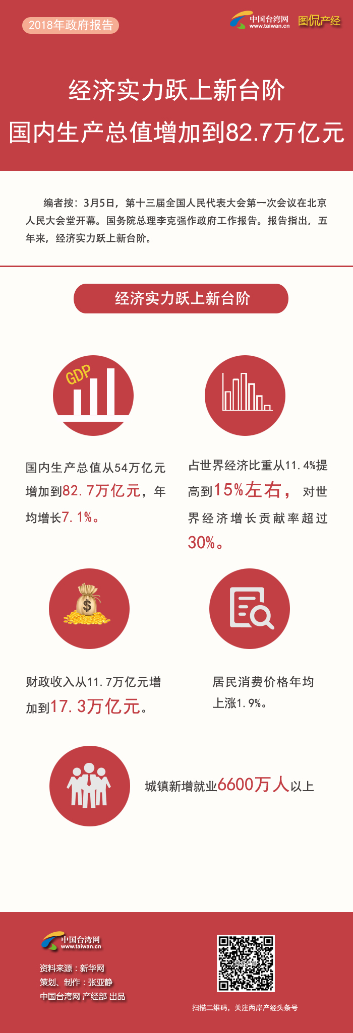 編者按:3月5日,第十三屆全國人民代表大會第一次會議在北京人民大會堂開幕。國務院總理李克強作政府工作報告。報告中指出,五年來,經(jīng)濟實力躍上新臺階。