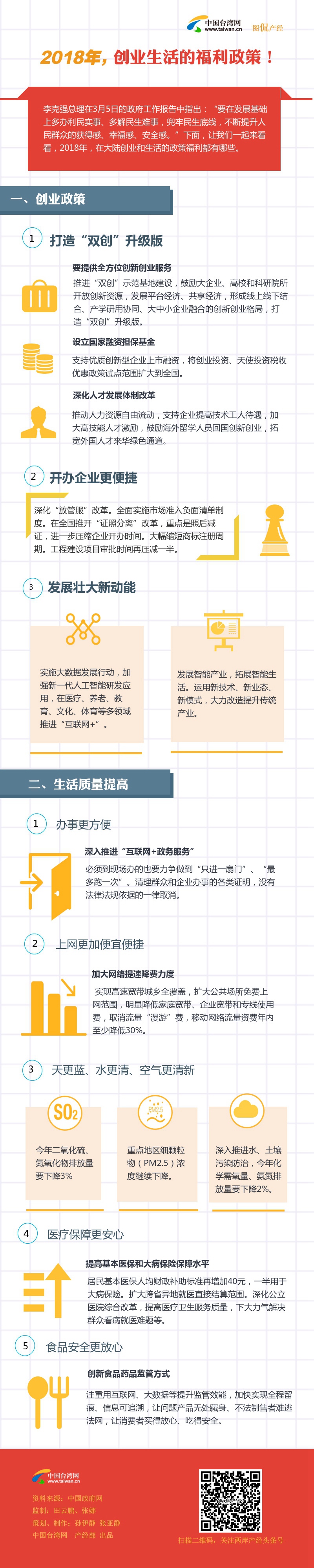 李克強(qiáng)總理在3月5日的政府工作報告中指出:“要在發(fā)展基礎(chǔ)上多辦利民實(shí)事、多解民生難事,兜牢民生底線,不斷提升人民群眾的獲得感、幸福感、安全感!毕旅,讓我們一起來看看,2018年,在大陸創(chuàng)業(yè)和生活的政策福利都有哪些。