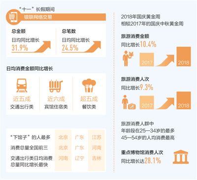 中國銀聯(lián)8日發(fā)布2018年國慶黃金周銀聯(lián)網(wǎng)絡交易數(shù)據(jù)!笆弧遍L假期間,銀聯(lián)網(wǎng)絡交易總金額達到1.58萬億元,交易總筆數(shù)7.94億筆,日均較去年國慶黃金周分別增長31.9%和24.5%。今年國慶7天的銀行卡跨行交易規(guī)模超過去年國慶黃金周8天的總量,創(chuàng)國慶長假歷史新高。