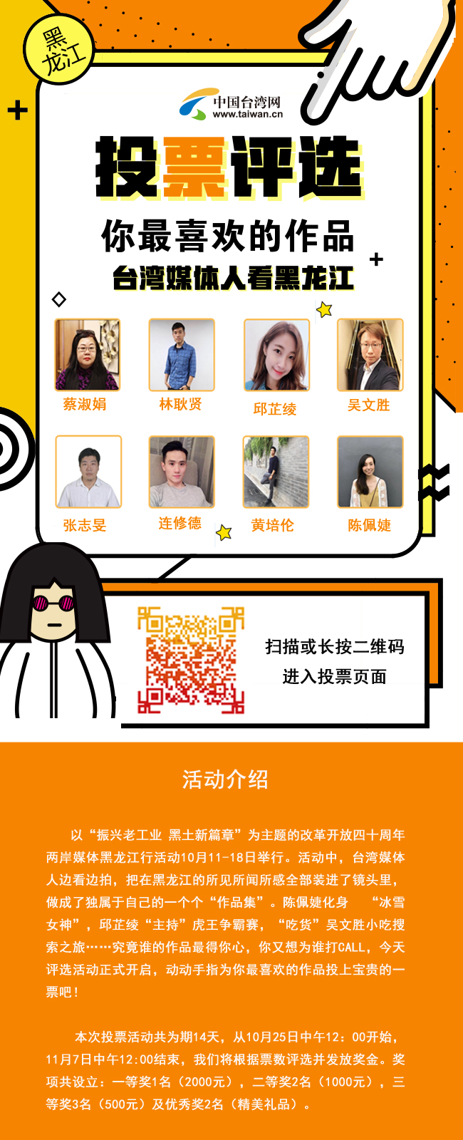 活動中,臺灣媒體人邊看邊拍,把在黑龍江的所見所聞所感全部裝進了鏡頭里,做成了獨屬于自己的一個個“作品集”。臺灣自媒體人陳佩婕化身“冰雪女神”,邱芷綾“主持”虎王爭霸賽,“吃貨”吳文勝小吃搜索之旅……究竟誰的作品最得你心,你又想為誰打CALL,今天評選活動正式開啟,動動手指為你最喜歡的作品投上寶貴的一票吧!