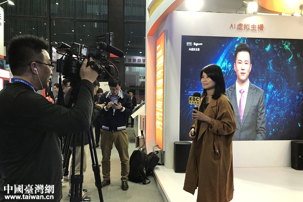 臺(tái)灣東森新聞?dòng)浾咴谒压氛古_(tái)的“AI虛擬主播”進(jìn)行采訪介紹。(中國(guó)臺(tái)灣網(wǎng) 張亞靜 攝)