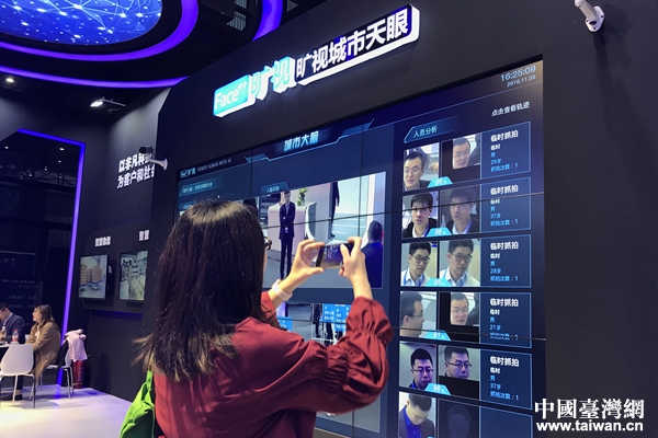 一位參觀者用手機(jī)拍攝被天眼人臉識(shí)別后拍下的圖像。(中國(guó)臺(tái)灣網(wǎng) 張亞靜 攝)