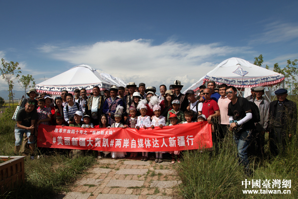 阿克奇村民和“你好新疆——塞外江南大轟趴”采風(fēng)團(tuán)合影。(中國臺(tái)灣網(wǎng) 王怡然 攝)