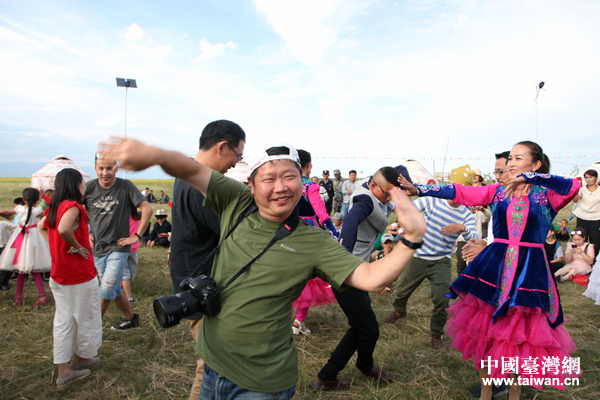 臺(tái)灣90后攝影師楊東霖(右者)體驗(yàn)哈薩克族秋千。(中國臺(tái)灣網(wǎng) 王怡然 攝)