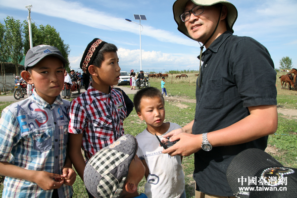阿克奇村的孩子被臺(tái)灣航拍達(dá)人田欣云的無人機(jī)吸引。(中國臺(tái)灣網(wǎng) 王怡然 攝)