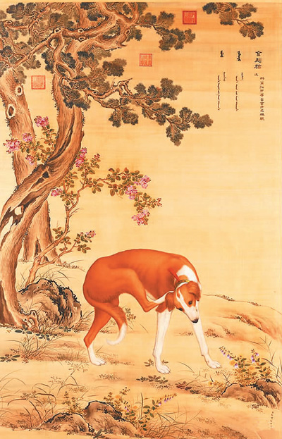 郎世寧在宮廷內(nèi)創(chuàng)作的《十駿犬圖》軸10幅,畫了10條品種高貴的名犬,分別命名為“霜花鷂”、“睒星狼”、“金翅獫”、“蒼水虬”、“墨玉璃”、“茹黃豹”、“雪爪盧”、“驀空鵲”、“斑錦彪”和“蒼猊”。