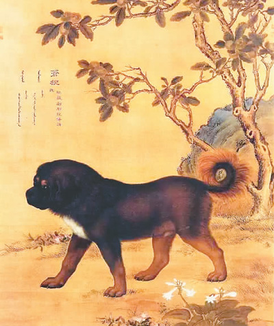 前9條狗都屬小頭長吻、細腰長腿的品種,均為擅長奔跑的獵手,最后那條威猛的大狗,從外形看應是藏獒。畫上所題寫的字句顯示,這些名犬大都是各部落的首領或地方官進獻給乾隆的。