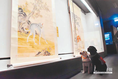 1月29日的開展儀式上,臺北故宮博物院還請來3只導盲犬進入展廳,讓畫犬、真犬相見歡。除了警犬和輔助犬,狗兒一般不被允許進入博物館內(nèi)。當導盲犬牽引著服務對象來到郎世寧的《十駿犬》畫作前時,畫面相當溫馨有趣。