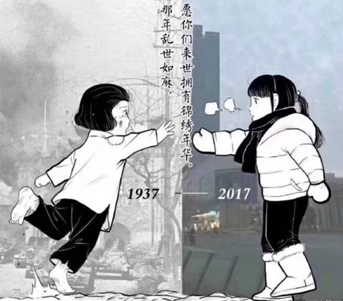 一邊是1937年,遍地烽火;一邊是2017年,盛世繁華。隔著時(shí)空的兩個(gè)小女孩,一邊衣衫襤褸、滿臉恐慌;一邊羽絨服雪地靴,幸福滿滿。她們都將手伸向?qū)Ψ剑瑵M眼渴望。圖片中間的一行字,更是像針一樣刺向每位觀者的心——