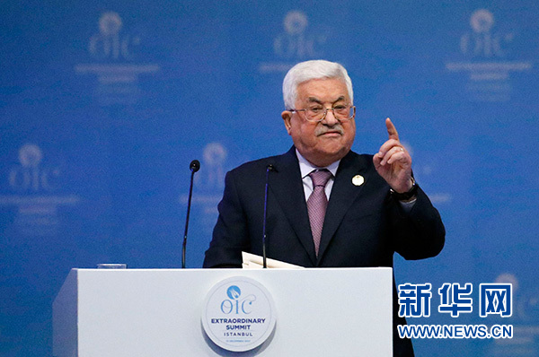 12月13日,在土耳其伊斯坦布爾,巴勒斯坦國總統(tǒng)阿巴斯在伊斯蘭合作組織特別首腦會議上講話。新華社/阿納多盧通訊社