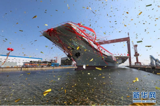 2017年4月26日,我國(guó)第二艘航空母艦下水儀式在中國(guó)船舶重工集團(tuán)公司大連造船廠舉行。圖為航空母艦下水儀式現(xiàn)場(chǎng)。