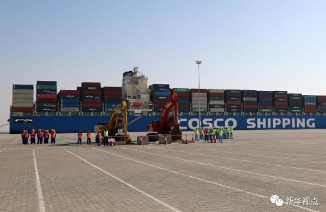 2017年11月5日在阿聯(lián)酋拍攝的中遠(yuǎn)海運(yùn)港口阿布扎比碼頭正式動(dòng)工暨場(chǎng)站租賃簽約儀式現(xiàn)場(chǎng)。 新華社記者蘇小坡攝