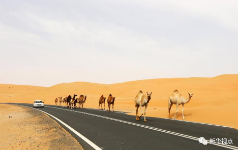 2016年5月6日拍攝的阿聯(lián)酋的利瓦沙漠公路上的駝隊(duì)。 新華社記者 李震攝