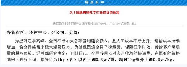 據(jù)媒體報道,10月11日,圓通在內(nèi)網(wǎng)發(fā)布《關(guān)于圓通網(wǎng)絡(luò)旺季市場提價的通知》(以下簡稱“《通知》”)稱,經(jīng)總部研究決定:自即日起,全網(wǎng)各網(wǎng)點對客戶收取的快遞費,在原有的價格基礎(chǔ)上進行上調(diào),指導(dǎo)價為1kg(含)以內(nèi)上調(diào)0.3元/票,超過1kg(公斤)部分上調(diào)0.3元/kg。