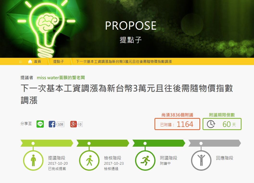 提議者談到根據(jù)2016年“主計(jì)處”的統(tǒng)計(jì)資料,臺(tái)灣人均GDP為22540美元,但臺(tái)灣民眾卻沒有如此的薪資待遇,他認(rèn)為“其勞動(dòng)成果已被剝削”;還指出,若沒加入“隨物價(jià)指數(shù)調(diào)漲”的說明,薪資將會(huì)被通貨膨脹所抵消。