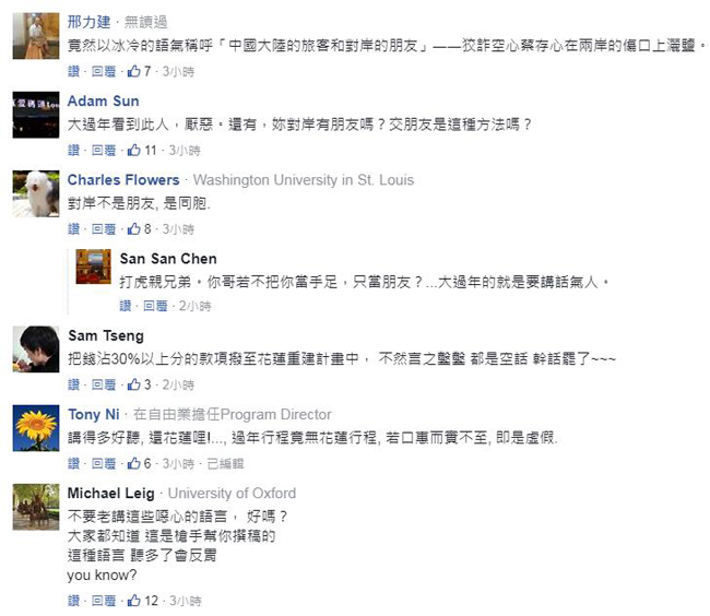 此視頻一經(jīng)發(fā)出,立即引發(fā)網(wǎng)友“熱烈回響”。網(wǎng)友紛紛在下方留言:“菜英文以后不要?jiǎng)硬粍?dòng)就喊全臺(tái)灣人,因?yàn)槟阋呀?jīng)把臺(tái)灣撕得四分五裂了”;“‘我要請(qǐng)大家放心,不論發(fā)生什么事,全臺(tái)灣一定會(huì)跟花蓮人站在一起’……擅長講這類的話,這讓我想到‘勞工是心中最軟的一塊’”;“講得多好聽, 還花蓮哩!……過年行程竟無花蓮行程,若口惠而實(shí)不至,即是虛假”。