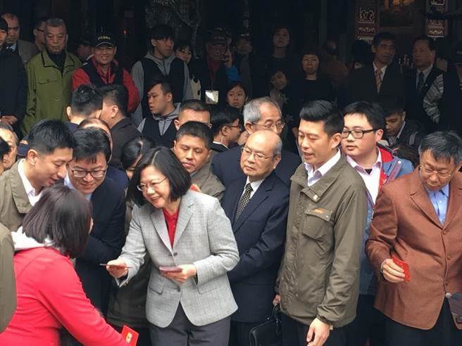 蔡英文發(fā)放紅包,臺北市長柯文哲在一旁。(圖片來源:臺灣“中時電子報”)