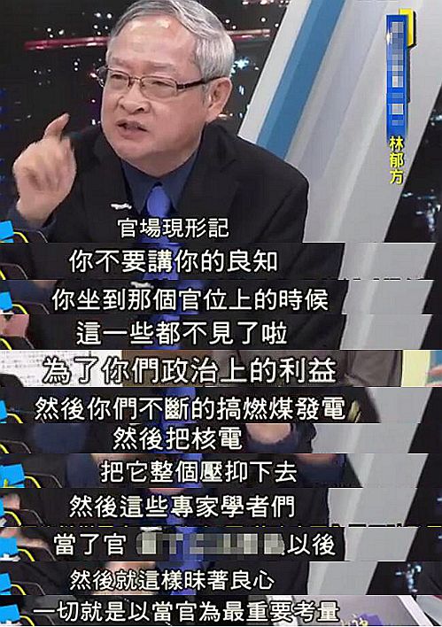 前“立委”林郁方更痛心疾首的表示,他看到了現(xiàn)實(shí)版的“官場(chǎng)現(xiàn)形記”,痛批蔡英文當(dāng)局“為了政治上的利益”不斷靠燃煤發(fā)電;林也狠戳臺(tái)灣所謂專家、學(xué)者的脊梁骨,“當(dāng)了官以后就昧著良心,一切以當(dāng)官為最重要考量”!