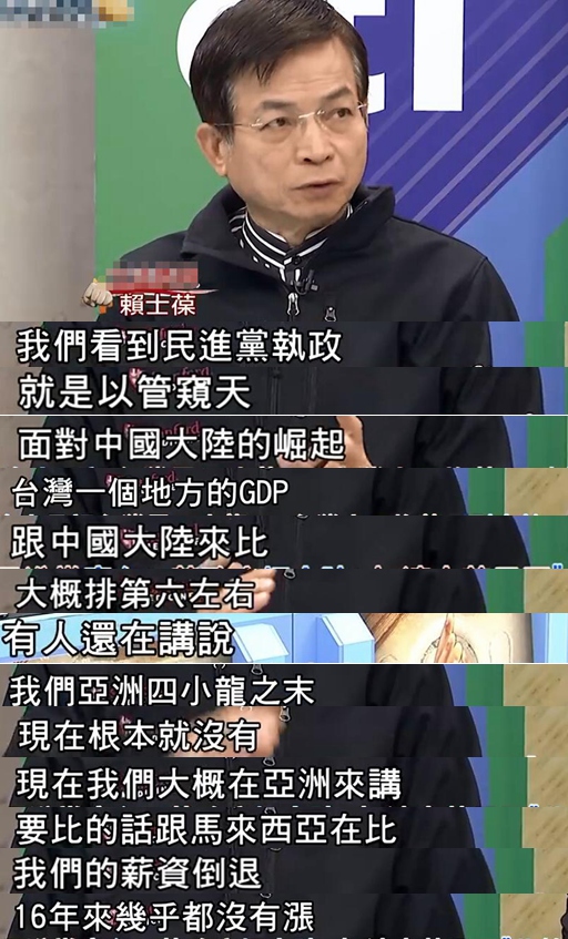 民代賴士葆就指出,臺灣薪資已經(jīng)16年幾乎沒漲過,而在民進(jìn)黨執(zhí)政后更用“以管窺天”的心態(tài)因應(yīng)世界大趨勢,“有人說我們是‘亞洲四小龍’之末,現(xiàn)在根本就沒有”。他更強(qiáng)調(diào),如今大陸已經(jīng)崛起了,而臺灣的GDP在大陸只能排第六或第七而已;黃智賢也直言,人家那“三小龍”并不承認(rèn)臺灣是第四小龍,“叫做臺灣是一條蟲”……
